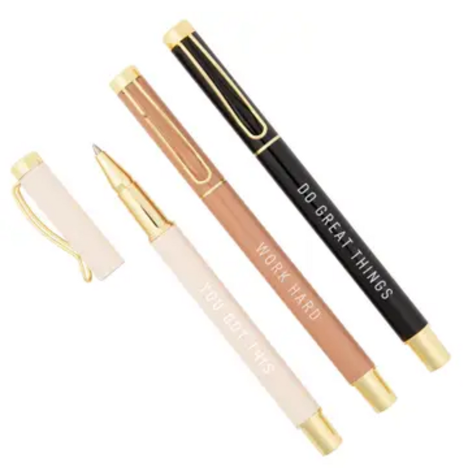 Pens Read: Work Hard, You Got This, Do Great Things • Pen Colors: Smokey Mauve, Light Pink, Black • Gold Features with White Lettering • Medium Ballpoint Pens | Black Ink • 3 Pens per Set - Each with a Cap • Box Dimensions: 2.37” x 6.25” x 0.75” • Pen Dimensions: 5.37” • Ink Refill: Parker Medium Ballpoint Refill (or similar brand) • Packaged in a Clear Box • Designed in the USA, Imported